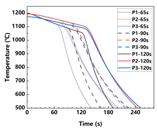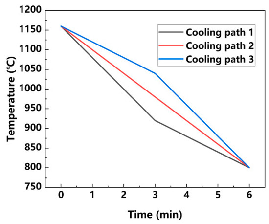 From Figure 9 and Table 2, it is evident that the average cooling rates of the three cooling curves between the solid solution temperature of 1160 °C and 800 °C are the same as 60 °C/min. The difference lies in the fact that for Cooling Curve 1, the average cooling rate is constantly at 80 °C/min for the first three minutes and then switches to a constant rate of 40 °C/min for the last three minutes; conversely, Cooling Curve 3 exhibits the opposite pattern; Cooling Curve 2 maintains a constant rate of 60 °C/min throughout the process.