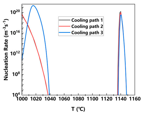 As shown in Figure 10, the nucleation rates for the three cooling curves in the first nucleation interval differ: Cooling Curve 1 (1.5 × 1020 m−3s−1) has the highest nucleation rate, followed by Cooling Curve 2 (0.97 × 1020 m−3s−1), and then Cooling Curve 3 (0.32 × 1020 m−3s−1), which is consistent with the initial cooling rates.