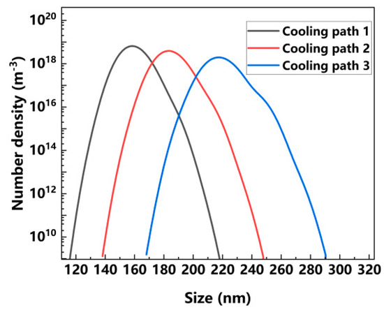 Figure 11 shows the Particle Size Distribution (PSD) at 800 °C. With a slow initial cooling rate (as in Cooling Curve 3), there are relatively fewer nucleation sites, but each nucleation site has a longer growth time, leading to the formation of larger precipitates. In contrast, rapid initial cooling (as in Cooling Curve 1) can quickly lead to a supersaturated state within the material, increasing the number of nucleation sites. However, due to the rapid cooling rate, the growth time is decreased, resulting in smaller sizes of precipitates. Cooling Curve 2, with a constant cooling rate, falls between these two extremes. The average sizes of the precipitates, following the cooling paths 3, 2, 1, are, respectively, 217 nm, 183 nm, and 166 nm.