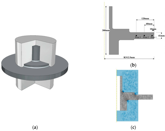 The computational model. (a) The three-dimensional model; (b) the outline and measurement point dimensions; (c) the FEM model.