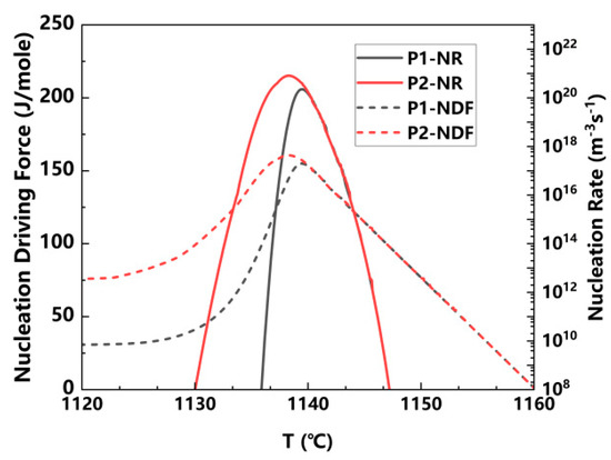 Nucleation driving force and rate at 65 s air-cooled P1/P2 measurement points during primary precipitation.