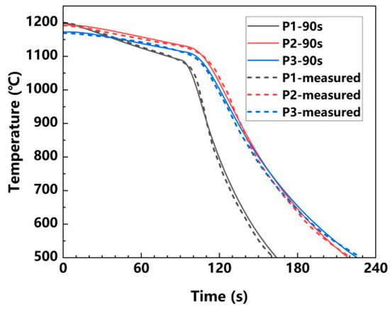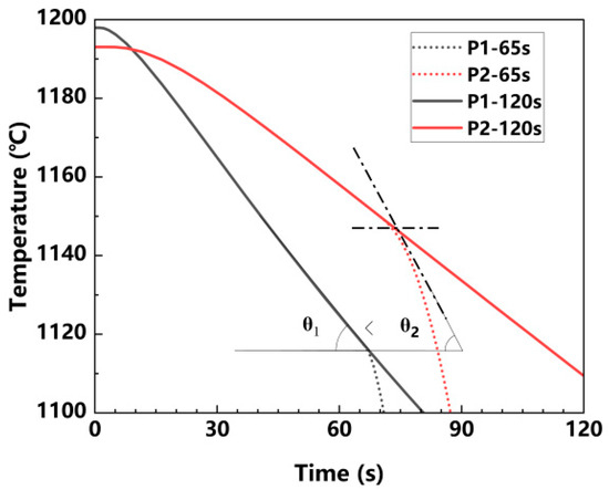 Through kinetic calculations, the average size distribution of the precipitate phases at the measurement points under different air-cooling times is obtained and shown in Figure 15. Observations indicate that the closer to the disk rim, the smaller the average size of the precipitate phases (except for P1/P2 under 65 s air cooling + oil quenching). The shorter the air-cooling time, the smaller the average size of the precipitate phases. For the 65 s air cooling + oil quenching, the size at P2 is smaller than that of P1, as shown in Figure 16. By observing the nucleation driving force and rate at the two points during the first precipitation interval, it is found that P2 is slightly higher than P1. By extracting the cooling curves within the temperature range of the first precipitation interval (as shown in Figure 17), it can be seen that the tangent angle at the first precipitation point is greater than , which means that the cooling rate at P2 is higher than that at P1 at this moment. Although the cooling rate of the entire curve at P1 is higher than that at P2 in the initial stage, the local cooling rate near the precipitation point affects the subsequent nucleation and growth.