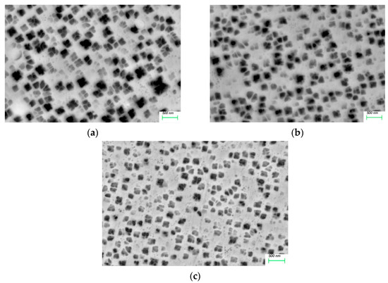 Conversely, at a lower cooling rate, such as 20 °C/min (as shown in Figure 7c), the observed microstructural features include large-sized secondary precipitates and the formation of fine tertiary precipitates within their channels, as indicated by the red dashed box in the figure. This multimodal distribution of phases suggests that slower cooling rates not only promote the size growth and morphological changes of the primary phase but also permit the nucleation and growth of tertiary phases in the interstices, exhibiting a spherical shape. As the cooling rate further decreases, the morphology of the secondary precipitates transitions from spherical to cuboidal (as shown by the blue box in Figure 7b) and ultimately to butterfly-shaped (as shown by the blue box in Figure 7c), reflecting the influence of cooling rate on the nucleation rate and growth kinetics of the precipitates. These observations align with the conclusions drawn by R. Radis et al. [21], who utilized the Matcalc software (https://www.matcalc.at/, accessed on 1 June 2024) to investigate the precipitation behavior of U720Li alloy under varying cooling rates. Huang et al. [41] further elucidated, through energy dispersive spectroscopy (EDS) and three-dimensional atom probe tomography (3D-APT) studies, that the decrease in cooling rate leads to the formation of elastic strain energy due to lattice mismatch, resulting in morphological changes in the secondary phases. Furthermore, enrichment of different elements was observed in the channels of the multimodal distribution, indicating the redistribution of elements during the precipitation process, i.e., changes in solute concentration. These factors are incorporated into kinetic models to more accurately describe and predict the behavior of precipitates. These research findings collectively affirm the significant impact of cooling rate on the size and distribution of precipitates.