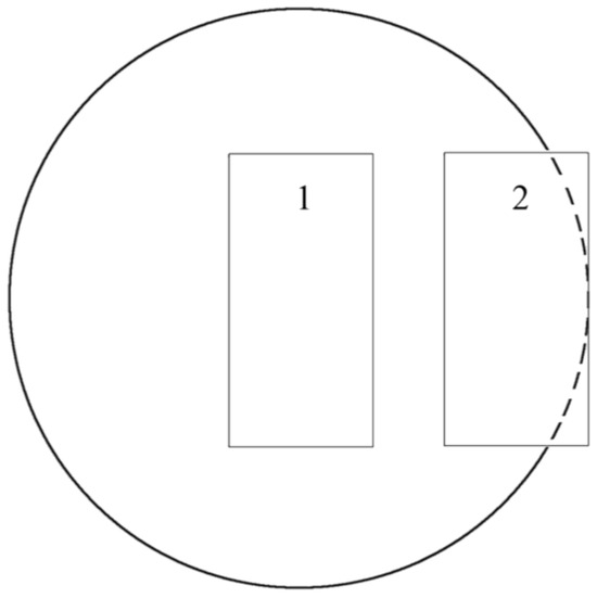 Scheme of the location of the regions studied by X-ray diffraction in the sample with a diameter of 8 mm after HPT; 1—location of the survey region when investigating the central part of the sample, 2—location of the region when investigating the peripheral part of the sample.