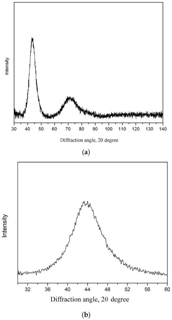 The initial samples of the alloy were amorphous. Figure 2a shows an X-ray diffraction pattern of the initial amorphous alloys. Figure 2b shows the region of the main diffuse peak; most of the research was carried out in this region of the X-ray spectrum, since any changes in the X-ray pattern are best seen in this angular region.