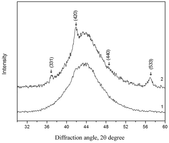 An X-ray diffraction pattern of the deformed Zr55Cu30Al10Ni5sample: central (1) and peripheral (2) parts of the sample. The location of the regions under study corresponds to regions 1 and 2 in Figure 1.