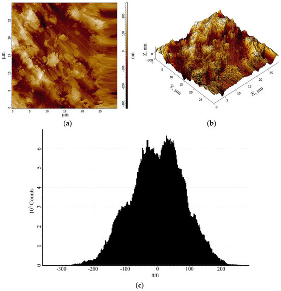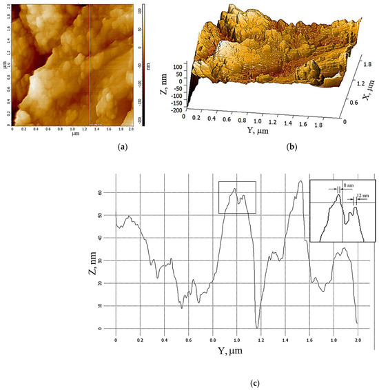 The size of the regions under analysis was 30 µm × 30 µm. To obtain the image, the 768 × 768 point regime was used. Under these conditions, the distance between the points was 39 nm. Table 1 summarizes the numerical values of the roughness of the surfaces, the difference between the highest and lowest points, the maximum heights of the steps, and the depths of the hollows.