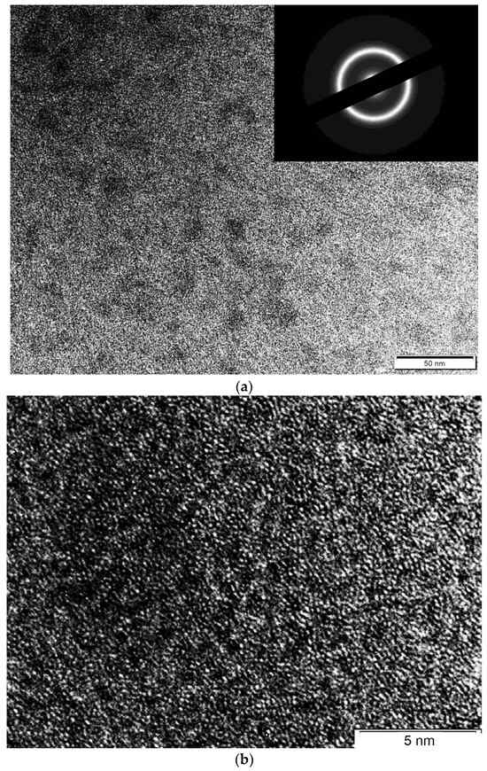 In the high-resolution electron microscope images of the part of the samples after deformation, the structure of which remains amorphous (Figure 3, curve 1), regions with a dark contrast appear. The images of these samples refer to the central region of the deformed sample. Figure 7a shows an image of the deformed sample with these regions. The size of these regions is 1–5 nm. However, these regions remain amorphous. No contrast typical of a crystalline structure is observed in the high-resolution image of these regions (Figure 7b). Only halos from the amorphous matrix are observed in the electron diffraction pattern. The electron diffraction pattern also shows no signs of reflections from crystals.