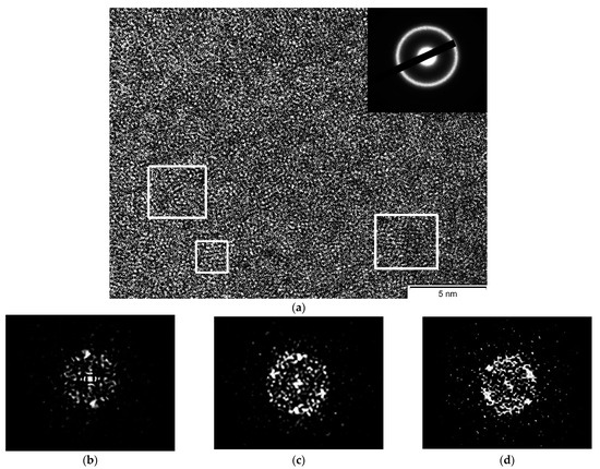 Currently, the nature of the regions with a contrast that differs from the matrix contrast is unclear. It may be related to the concentration redistribution of components at the nanoscale, which is insufficient for nanocrystalline phases to be formed. A similar change in the contrast under the severe plastic deformation of Zr-based bulk samples was observed in [37]. The authors of this work attributed the variation in contrast to chemical short-range segregation. As is known, diffusion processes occurring in BMGs and related to the redistribution of constituent elements can be stimulated by deformation [38]. Note that the variation in contrast (dark/light regions) disappears when nanocrystals are formed. As stated above, in the sample regions deformed by e = 4.83, nanocrystal formation occurs. Figure 8a shows a high-resolution electron microscope image of the corresponding region. The inset illustrates the electron diffraction pattern; an inhomogeneous contrast related to the presence of nanocrystals is visible in the halo. As can be seen in the figure, nanocrystals have a size of 1–4 nm. In the image, some regions with nanocrystals are framed. Images of the fast Fourier transformation (FFT) of these regions are depicted in figures (Figure 8b–d). In these figures, one can see an apparent strengthening of the reflections corresponding to diffraction peaks from nanocrystals.
