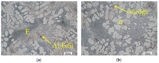 Microstructure of alloy A, etch. Dix–Keller: (a) α-phase, eutectic, and Al5FeSi needles; (b) α-phase, eutectic, and sludge phases.