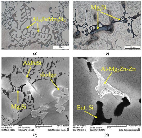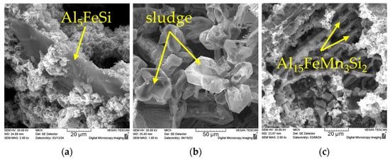 Needle-like Al5FeSi phases (Figure 5a) are generally undesirable in the microstructure of aluminium alloys. Their 3D morphology is plate-like, causing stress concentration in the material. Additionally, Al5FeSi plates are very hard, and brittle compared to the matrix, resulting in the degradation of mechanical and fatigue properties. Due to the manganese alloying, the ferrous phases are found in the structure of the investigated alloys mainly in the form of skeleton (Figure 5c) and sludge phases (Figure 5b), which have a positive effect on the mechanical and fatigue properties. Skeleton-like Mg2Si phases are occasionally observed within the microstructure.