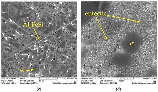 Microstructure of alloy B: (a) alpha phase and eutectic, etch. Dix–Keller; (b) skeleton-like Al15FeMn3Si2 phases and sludge Al-Fe-Mn phases, etch. Dix–Keller; (c) needle-like Al5FeSi phases, etch. 0.5% HF, SEM; (d) detailed view of eutectic silicon crystals, etch. 0.5% HF, SEM.