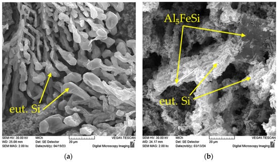 The alloys differ visibly in the shape and size of the eutectic silicon. In Alloy A, the eutectic silicon crystals are shaped similarly to corals, growing as rods in clusters (Figure 4a). In Alloy B, the eutectic silicon is significantly finer due to the use of the Sr modifier. The silicon grows around the intermetallic phases, but its shape is unrecognisable (Figure 4b).