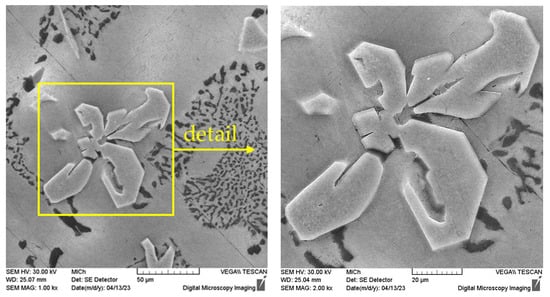 The microstructure was further observed and documented with a TESCAN VEGA LMU II scanning electron microscope (TESCAN VEGA, Kohoutovice, Czech Republic). For this purpose, samples of each melt were prepared by a standard procedure. In addition to etching with 0.5% HF, the samples were deeply etched with concentrated HCl, enabling the 3D morphology of the individual phases to be observed after the alpha phase was etched away.