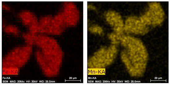 The identification of the various structural phases was also verified by EDX analysis using a scanning electron microscope. The presence of iron and manganese was proved in the sludge phases (Figure 6), which is in accordance with previous works of Sanchez [33], Liu [28], and Fu [34].