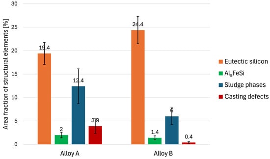 By quantitative analysis, the structural parameters of the studied alloys were compared, providing deeper insight into the microstructure changes based on the chemical composition. The individual comparisons are presented in Figure 7, Figure 8 and Figure 9. By comparing the area fraction of the individual phases, we found that their amount is significantly different in the tested alloys (Figure 7). Alloy B has a higher content of eutectic silicon, with up to a 5% increase compared to Alloy A. Sludge phases based on Al-Fe-Mn are the dominant intermetallic phases in both alloys. However, Alloy A has twice the amount of sludge phases (12.4%) compared to Alloy B. Due to the manganese alloying, needle-like phases occur only in small amounts in the microstructure of both alloys with a slightly higher area fraction observed in Alloy A. This alloy also has a significantly higher amount of casting defects.