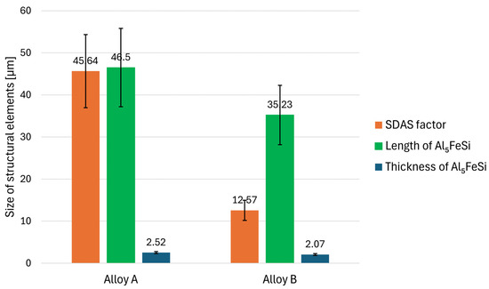 The data presented in Figure 8 show that Alloy B has a significantly lower SDAS factor compared to Alloy A. This is likely attributed to the use of grain refiner and modifier in production combined with the higher cooling rate. The needle-like Al5FeSi phases are longer and slightly thicker in Alloy A. Therefore, in combination with the reduced SDAS factor, an increase in mechanical properties, especially ductility, can be expected in Alloy B.