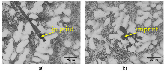 The microstructure of aluminium alloys consists of many phases that differ significantly in their properties. When measuring hardness, it is important to consider that the measured hardness is strongly influenced by the microstructure directly at the point of indentation. Therefore, Brinell hardness measurement is recommended for cast aluminium alloys. The relatively large ball used in this measurement covers a larger area containing all structural phases, gaining more accurate results. Vickers microhardness HV0.01 was measured to detect differences in the hardness of each phase (Table 2). The hardest phases of the structure of AlZn10Si8Mg alloys are eutectic silicon and ferrous phases, while the dendrites of the alpha phase have the lowest hardness. The eutectic is composed of very hard crystals of eutectic silicon and soft alpha phase, resulting in higher hardness compared to the matrix. Sludge phases, being larger than needle phases, exhibit greater resistance when measuring hardness (Figure 10). In Alloy B, it is not possible to measure the hardness of the eutectic silicon because its crystals are too fine. The increased hardness of the alpha phase in Alloy B can be explained by the higher amount of eutectic in this alloy. The hard crystals of eutectic silicon are located just below the measured area, increasing the hardness of the matrix. The increased hardness of the eutectic is due to the tight arrangement of the smaller eutectic silicon crystals in Alloy B.