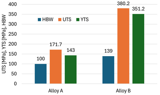 A summary of the experimentally determined structural, mechanical, and corrosion properties of the investigated AlZn10Si8Mg alloys is presented in Table 4. The different microstructure parameters resulted in a significant increase in UTS, YTS, and HBW in Alloy B.