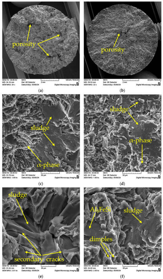 Fractographic analysis of fracture surfaces, SEM: (a) overall view of A alloy sample; (b) overall view of B alloy sample; (c) detailed view of alloy A; (d) detailed view of alloy B; (e) cracking of sludge phase in Alloy A; (f) cleavage of ferrous phases and dimple morphology of the alpha phase.