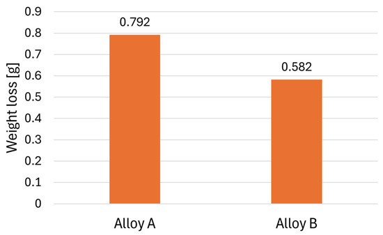 The corrosion resistance of the studied alloys was evaluated by measuring the weight loss following the Audi test (Figure 13). A lower weight loss indicates better corrosion resistance. The results revealed that Alloy B samples exhibited a weight loss of 0.582 ± 0.02 g, whereas Alloy A samples exhibited a weight loss of 0.792 ± 0.05 g during the test. These findings indicate that Alloy B demonstrates greater resistance to corrosion in this environment. However, the Audi test is not sufficient to characterise the corrosion resistance, so further research with more accurate methods is needed.