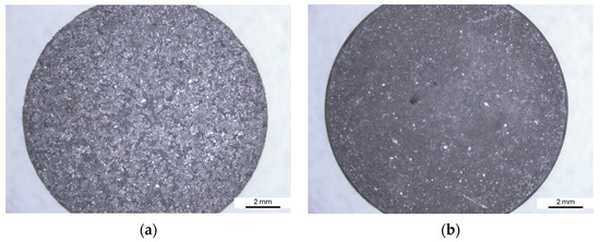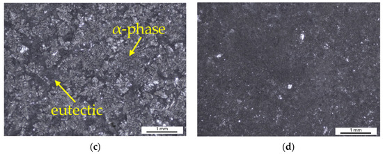 Brinell hardness tests were performed according to ISO 6506-1 [30] using CV-3000LDB hardness tester (LFC PTE LTD, Batam, Indonesia). A 5 mm diameter hard-metal ball was pressed for 10 s under a load of 250 kp. The reported hardness values represent the average of five measurements gained from the specimen. All measurements were performed at room temperature. Vickers microhardness was measured according to ISO 6507-1 [31] with a Zwick/Roell ZHµ microhardness tester (ZwickRoell, Ulm, Germany). A load of 10 g was applied for 10 s, with five indentations made for each phase. The resulting value represents the average of these measurements, ensuring a robust and accurate microhardness evaluation. Two samples of each alloy were used for microstructure observation and hardness measurements.