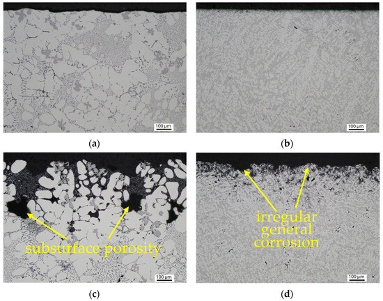 The weighing results were further validated by examining of the sample surfaces after the Audi test (Figure 14). Alloy A samples exhibit a greater extent of corrosion (Figure 14a). Upon closer inspection at higher magnification, general corrosion of the entire surface is observed. However, the surface of the specimen is attacked irregularly (Figure 14c). Corrosion initiation occurs where the protective oxide layer has been disrupted, particularly in the eutectic region, while the alpha-phase dendrites show better corrosion resistance. Irregular general corrosion is also visible on the surface of Alloy B (Figure 14b,d). Compared to Alloy A, there are fewer initiation points in this alloy with a damaged protective layer. The corrosion attack is less extensive and there is no significant penetration into the material.