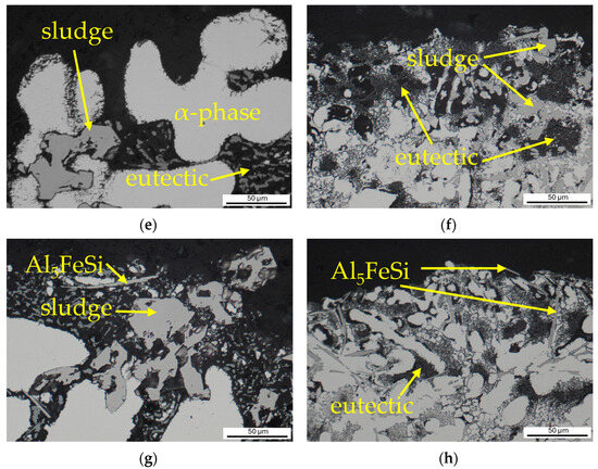By comparing the cross-sections of the samples of the investigated alloys after the Audi test, it was found that the corrosion attacked Alloy A to a significantly greater depth (Figure 15c,d). The finer microstructure of Alloy B played a significant role. Sludge iron phases cause eutectic dissolution because they form micro galvanic cells of two phases with different potentials (Figure 15e–h). Al5FeSi needles have a stronger negative effect than sludge phases, as the latter possess potentials closer to the eutectic. While alpha-phase dendrites exhibit the highest resistance, they are also subjected to corrosion to a limited extent (Figure 15e). The influence of the individual phases on the corrosion mechanism did not change in the alloys studied. The enhanced corrosion resistance of Alloy B with a higher copper content may be attributed to the use of a grain refiner and modifier, which contributed to the fine microstructure.