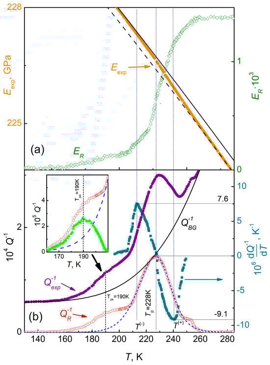 The temperature dependence of the resonant component of the Young’s modulus for state (II) is shown in Figure 1a. Its graph has the shape of a step with a height characteristic of relaxation resonances (Table 1).