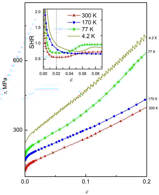 The experimental results for structural state (I) are shown in Figure 2 with a series of compression deformation diagrams for the coordinates “shear stress τ—strain ε” at a given strain rate = 4·10−4 s−1.