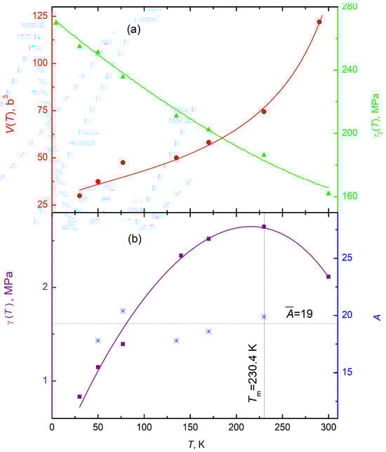 Temperature dependences of plasticity characteristics in state (I) at :▲—yield stress and ●—activation volume of the plastic deformation process ; ■—speed sensitivity of deformation stress and *—empirical values of parameter A. In (a,b), solid lines show analytical approximations of experimental points using theoretical relationships (32).