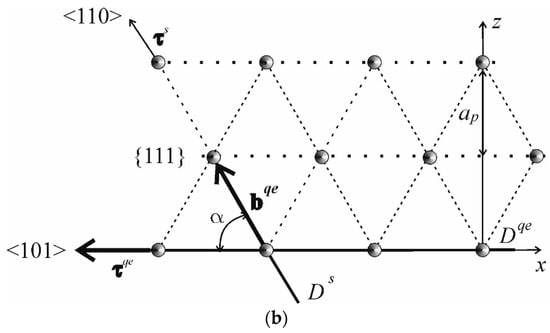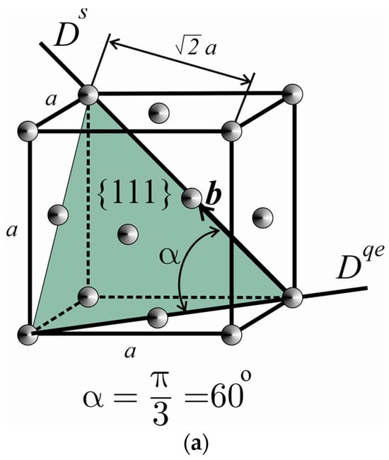 In fcc crystals at the initial stage of deformation, dislocation plastic sliding predominantly occurs along close-packed <110> directions and {111} planes (Figure 4). In the {111}<110> slip system, there are two types of rectilinear dislocations with the Burgers vector b whose lines and are oriented along the directions of dense packing. But for , the vector has a quasi-edge (close to the edge) orientation, and for the vector has a purely s screw orientation: the angle between the vector and the unit of the dislocation line has the value , and the angle between and is equal to zero, while ; is the distance between the nearest nodes.