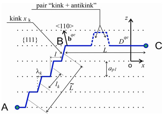 Configurations of dislocation lines in the {111}⟨110⟩ slip system in an fcc crystal: ABC—curved segment of a quasi-edge dislocation with a Burgers vector , the dotted line indicates the close packing directions; —period of the first kind Peierls relief in the direction of the axis ; a0 = b—period of secondary Peierls relief; L—length of straight segment BC in the relief valley; —length of the chain of AB kinks between relief valleys; —coordinate of a separate kink along the axis ; —kink width; l—distance between the centers of neighbouring kinks.