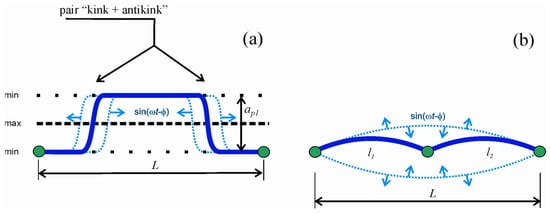 For Hasiguti peaks, Koiwa and Hasiguti [] considered the thermally activated detachment of a dislocation line segment from an individual point defect (impurity atom, vacancy, radiation defect, etc.) as an elementary relaxation process (Figure 6b). It has been established that vibrations of a chain of geometric kinks on a segment of a dislocation line with fixed ends are described by the equation of vibrations of a segment of a dislocation string [,].