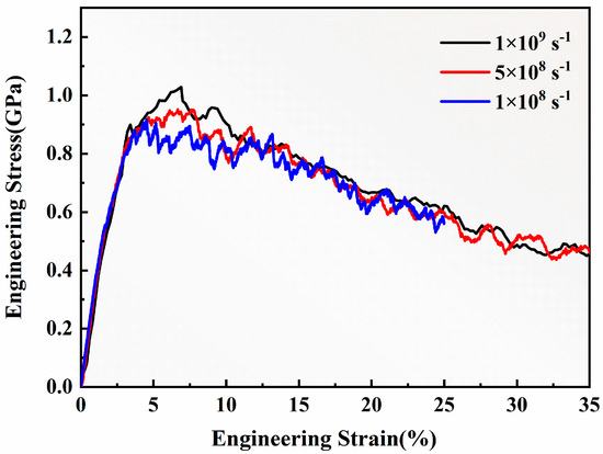 The engineering stress–strain curves of the polycrystalline γ-TiAl with an average grain size of 6.18 nm deformed at three sets of different strain rates are presented in Figure 2. It can be observed that the peak stress of the polycrystalline γ-TiAl increases with the increasing tensile strain rate. This is because at low tensile strain rates, the atoms have sufficient time to constantly move and adjust their positions, allowing the system to gradually approach equilibrium. However, when the strain rate increases, there is not enough time for the atoms to adjust their position, preventing the system from restoring equilibrium. Consequently, the higher the strain rate, the more difficult for the system to equilibrate, which increases the peak stress.