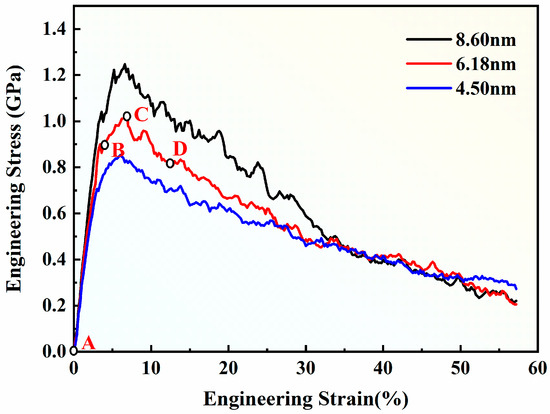 Figure 3 illustrates the tensile engineering stress–strain curves of polycrystalline γ-TiAl alloys with average grain sizes of 8.60 nm, 6.18 nm and 4.50 nm, it is found that the peak stress decreases as the grain size decreases. The main reason for this is that when the grain size decreases to the nanoscale, the proportion of grain boundaries increases significantly. With the continued reduction in grain size of the polycrystalline γ-TiAl, the grain deformation mechanism becomes dominated by grain boundaries. This dominance facilitates grain boundary sliding and grain rotation more easily, resulting in a reduction in peak stress. Therefore, the polycrystalline γ-TiAl begins to soften, and the inverse Hall-Petch (H-P) effect appears [23]. It should be noted that the inverse H-P effect has been studied by many researchers through extensive experiments and simulations. This phenomenon has been observed in various polycrystalline materials, including TiAl alloys [17,24,25]. The inverse H-P effect may be attributed to a change in the plastic deformation mechanism from dislocation-mediated plasticity to grain boundary sliding and grain rotation when the grain size is below a critical value. Ding et al. [24] studied the effect of grain size on the mechanical properties of polycrystalline γ-TiAl, and found that the inverse H-P effect occurred when the grain size was smaller than 8 nm. This was due to the deformation mechanism changing from the plasticity dominated by dislocation slip and deformation twins to grain boundary migration and grain rotation.