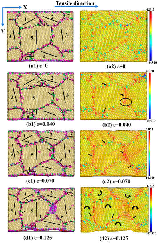 Comparing the changes in atomic configurations illustrated in Figure 4(a1–d1), it can be seen that some grain boundaries have been distorted to varying degrees (as indicated by arrows in Figure 4(b1–d1)). From Figure 4(a1–d1), the strain increases from 0 to 0.125, and the grain boundaries of grains 1 and 5 first become flat from local bending and then distort again. In addition, the grain boundaries between grains 3, 4, and 5 gradually began to be local distortion. Specifically, the movement of atoms is hindered by grain boundaries, causing them to slip along the grain boundaries. In the light of this, the observed grain boundary distortions are attributed to the grain boundaries sliding during plastic deformation. Through observation of the triple junction of grain boundary in Figure 4(a1–d1), it can be found that the grain boundary between grain 2 and grain 5 gradually slide towards the interior of grain 2. This movement causes the intersection of triple junction of grain boundary between grain 1, 2 and 5 to gradually shift directly upwards (as shown by the ellipses in Figure 4(b1–d1)). Additionally, during the deformation process, the intersection of triple junction of grain boundary between grains 4, 5 and 6 gradually slide towards the lower boundary of the model. This results in the gradual contraction of grain 6 (as shown by the rectangle in Figure 4(a1,d1)), and the lower end of the grain 5 can be observed sliding towards the interior of the grain 6. During the process of increasing strain, atoms near the grain boundaries diffuse from one grain to another, causing the grains to continue to grow or shrink. This phenomenon can be attributed to grain boundaries sliding and atomic diffusion. At the strain of 0.125, the grain boundary between grains 3 and 7 exhibits a noticeably larger sliding amplitude, and the grain boundaries become thinner and thinner, ultimately leading to gradual disappearance of the grain boundary. Figure 4(a2–d2) display shear stress distribution with 0, 0.040, 0.070, and 0.125 strain, respectively. As the strain gradually increased to 0.070, it can be found that the shear stress presents a trend of increasing. A significant concentration of stress occurred at the grain boundary illustrated in Figure 4(c2) circled in black, when the stress reaches its peak state (corresponding to point C in Figure 3). Microcracks are initiated at this location and gradually necked along the grain boundaries (as shown by the curve at the edge of Figure 4(c2)). Li et al. [26] studied the tensile deformation behavior of polycrystalline Mo nanowires through molecular dynamics simulations and found that polycrystalline Mo necked and fractured at the grain boundaries during tensile deformation. This is because stress is highly concentrated at the grain boundaries, causing distortion of the nearby lattice and resulting in structural transformation. Interestingly, it can be seen that the positions with uneven distribution of shear stress corresponds to the position of grain boundary slip (as shown by the black arrows in Figure 4). This suggests that the distribution of shear stress at the grain boundary is uneven, causing local stress concentration at these points, which in turn promotes further grain boundary slip. The grain boundary atoms slide relative to the action of load, which leads to the rotation of grain orientation (as indicated by the curved arrow in Figure 4(d4)).