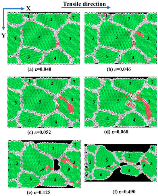 Figure 5 shows the process of dislocation emission and slip of polycrystalline γ-TiAl under different strains. The seven grains are numbered 1–7 in sequence. As can be seen from the black elliptic position in Figure 4(b2), when the strain is 0.040, large shear stress appears at the triple junction of grain boundary between grains 3, 4 and 5, where the polycrystalline γ-TiAl emits dislocations. Further analysis reveals that the dislocation is a Schokley dislocation (called dislocation 1) in the crystal plane of , slipping to the inside of grain 3 in the form of a dislocation ring. With a further increase in strain, the stress gradually approaches its peak, and dislocations are also emitted from another triple junction of grain boundary between grains 2, 3 and 5 (as shown by the red ellipse in Figure 5d). It can be found that the dislocation is the Schokley dislocation (called dislocation 2) in the crystal plane of , which also slips to the inside of grain 5 in the form of a dislocation ring. When the strain increases to 0.068, dislocation 2 approaches the grain boundary on the other side and is eventually absorbed by the grain boundary. Through analysis, it can be seen that it slides along the crystal plane of . As the tensile deformation progresses, it can be seen from Figure 5e,f that some grains successively emitted dislocations to coordinate the deformation of the unit cell, but the dislocation density of the whole cell remains low (as shown by the black arrow in Figure 5e,f). As discussed above, grain boundary sliding and grain rotation occur during the increase im tensile strain from ε = 0 to ε = 0.040, and the first dislocation 1 starts to emission when the strain is 0.040. This indicates that the grain boundary sliding and grain rotation are conducive to inducing dislocation emission from grain boundaries at the initial stage of tensile deformation, providing the conditions of orientation and shear stress. Dislocation slip only plays the role of coordinating deformation during plastic deformation, which is also hindered by grain boundaries. Researchers have also reported on this phenomenon through experimental means. Zhao et al. [32] observed severe distortion of some grain boundaries in the microstructure evolution diagram of Ti-6Al-4V alloy during superplastic deformation, and dislocations were only emitted from the grain boundaries. Therefore, they proposed that grain boundary sliding coordinated by dislocations is the main mechanism of tensile plastic deformation in Ti-6Al-4V alloy. Kim et al. [33] also observed obvious distortion of grain boundaries during the tensile deformation process of Ti-6Al-4V alloy, and concluded that grain boundary sliding is the main plastic deformation mode. In addition, they observed that the dislocation only emitted from the grain boundary, suggesting that dislocation slip played a coordinating role in tensile deformation.