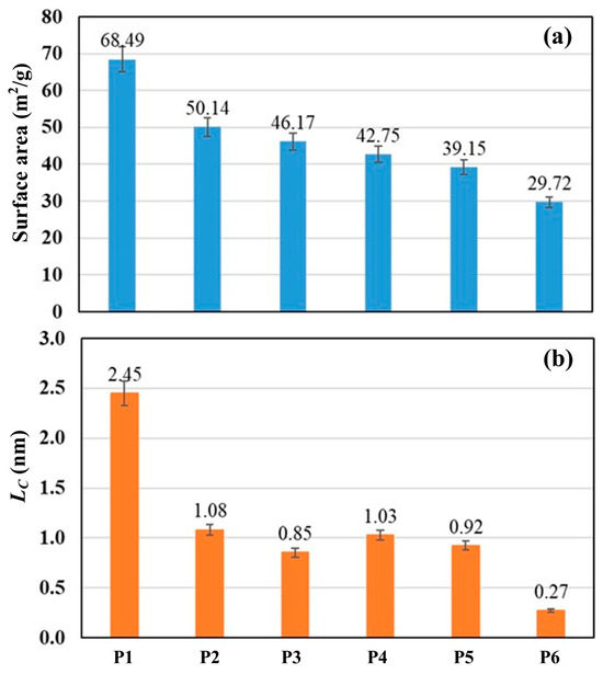 Figure 1 shows SEM images of the carbon derived from PS and PP mixtures in the cases of P1 and P4. It was observed that the char for P1 is in the form of carbon plates/flakes with a rough surface and pores, indicating a high surface area. In contrast, the char for P4 consists of smaller and finer particles. Figure 2 shows the surface area and crystallite size of the derived carbon. The carbon derived displays a semi-crystalline structure with crystallite sizes (LC) ranging between 0.27 and 2.45 nm. The crystallite size decreases with decreasing PS concentration in the blends. Furthermore, the surface area of the derived carbon ranges between 68.49 and 29.97 m2/g, also decreasing with decreasing PS concentration in the blends.