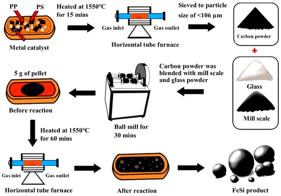 Carbon derived from waste plastics was used as a reducing agent in the experiments. Polymeric food packaging wastes, polystyrene (PS) and polypropylene (PP), were used in the present study. PS and PP were collected from a plastics recycler in the Samut Sakhon province of Thailand. It was cleaned and air dried before being used in the experiments. It was crushed into a size of <5 mm. PS was mixed with PP into 5 different ratios in order to reveal the mixture of the plastics in the waste stream and named mixtures P2–P6 as shown in Table 2. PS alone was used in the present study for comparison, and named P1. The mixtures were put in an alumina crucible along with an iron catalyst, and then pyrolyzed in a horizontal tube furnace for 15 min at 1550 °C under an inert argon atmosphere. The iron catalyst is a small iron chip used for enhancing the decomposition of polymers and the formation of graphitic carbon. The derived carbons were ground using a ring mill and sieved into a powder of <180 µm for the ferrosilicon synthesis experiment. The chemical composition of the carbons was analyzed using a LECO CHN628 analyzer, and is given in Table 2. LECO is the commercial company for the chemical analyzer, LECO Corporation, St. Joseph, MI, USA. Carbon content of the derived carbons ranges between 85.97 and 90.57 wt%.