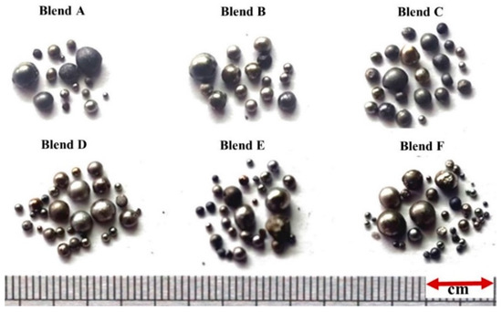 The produced metal droplets obtained after heating the pellets of Blends A to F at 1550 °C for 1 h.