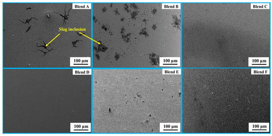 SEM (×100) images of the bulk metal for Blends A–F.