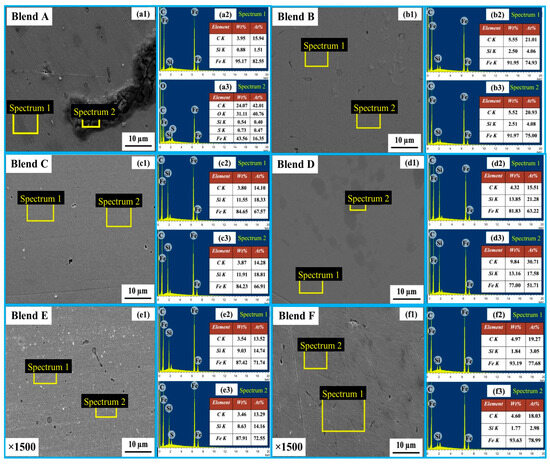 Figure 9 displays the elemental distribution in the bulk metal via SEM images and EDS elemental contour for Blends A through F. In these images, green, red, blue, and white dots represent Si, Fe, C, and O, respectively. It was observed that Si-C had distributed throughout the bulk metal alongside the Fe matrix. Particularly strong concentrations of Si were evident in the cases of Blends C through E, suggesting a more robust formation of the FeSi phase compared to the other blends.