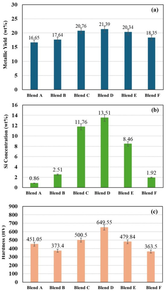 (a) Metallic yield, (b) Si concentration, and (c) Vickers hardness of the produced metals for Blends A–F.
