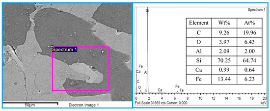 Figure 11 shows SEM and EDS analysis of the bulk metal for commercial FeSi75, which has a Si content of approximately 74–77 wt%. The commercial ferrosilicon was obtained from UMC Metal Co., Ltd., a steel mill located in Chonburi Province, Thailand. The dark gray area represents the silicon metal phase, while the light gray area indicates the FeSi/FeSi2 phases. EDS elemental analysis shows that the major component of the alloy is silicon, with a high concentration of 70.25 wt% or 64.74 at%, along with 13.44 wt% Fe. Small amounts of other elements were also detected, such as C, O, Al, and Ca. The Si concentration from the EDS results differs by about 6% from the material data sheet provided by UMC. However, the EDS results can be used to preliminarily determine the Si content in the metal. For precise determination of the Si content, the induced coupled plasma (ICP) technique is required. Unfortunately, due to the limitations of our laboratory, the ICP technique could not be conducted for the metal droplets produced in the present study.