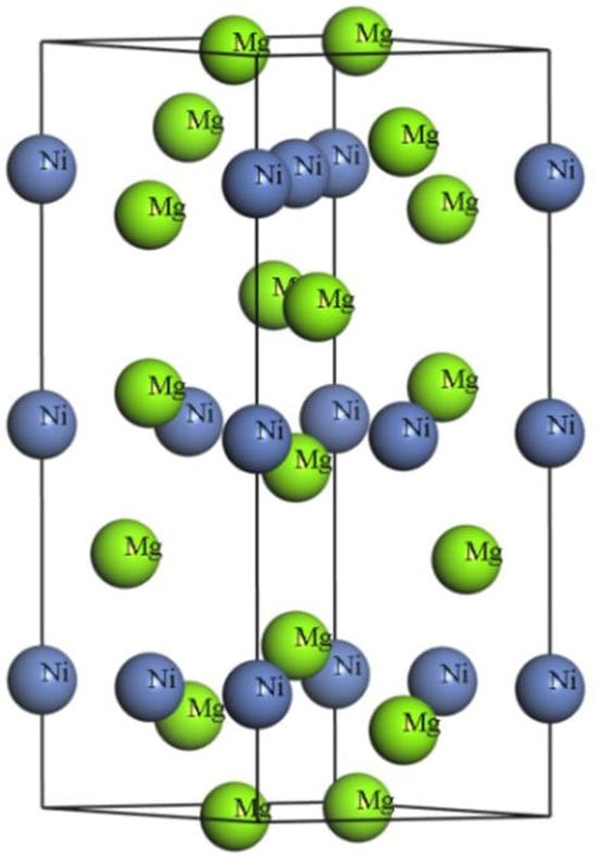 The atomic structure of Mg2Ni exhibits a hexagonal crystal system (as depicted in Figure 1) with highly symmetric , characterized by lattice parameters a = 5.219, c = 13.293 [] and space group P6222 (No. 180) []. There are 6 Ni atoms and 12 Mg atoms in each protocell, which can be partitioned into 6 levels parallel to the xy plane. Within each Mg layer, two Ni atoms fill the 3d and 3b positions, while within each Ni layer, four Mg atoms fill the 6i and 6f positions, respectively.