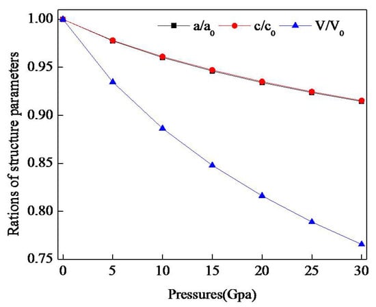 The structure of the cell was optimized, the pressure range was 0 to 30 GPa, and corresponding structural parameters at each pressure were obtained. The variation in the Mg2Ni cell’s , and cell volume as a function of pressure is presented in Figure 2. The values of parameters and gradually decrease as pressure increases, as the crystal cell experiences external forces under pressure, leading to a reduction in the distance between atoms and a subsequent decrease in the and parameters. Consequently, as pressure increases, volume V also decreases.