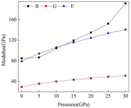 The relationship between shear modulus, bulk modulus, and Young’s modulus of the Mg2Ni intermetallic compound depending on pressure is illustrated in Figure 3. The shear modulus reflects resistance of the material to shear deformation under stress, while the bulk modulus indicates deformation resistance under applied stress, with higher values representing greater resistance. Young’s modulus characterizes the material’s stiffness, with larger values indicating greater stiffness. As depicted in Figure 3, it is evident that Young’s modulus (E), the shear modulus (G), and the bulk modulus (B) increase monotonically with increasing pressure. This behavior can be attributed to the symmetry of Mg2Ni’s hexagonal crystal system. The increase in external pressure alters the interatomic interactions within the lattice, consequently leading to an increase in the bulk, shear, and Young’s moduli of the crystals.
