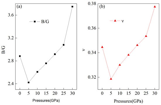 (a) Variation curves of modulus and (b) Poisson’s ratio () with pressure for Mg2Ni.