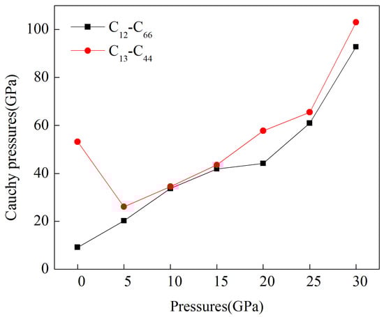 For the hexagonal crystal structure, the Cauchy pressure on the (100) face is denoted as (), while on the (001) face it is represented as (). In accordance with Pettifor’s rule [], a higher Cauchy pressure value indicates a greater number of metallic bonds within the metal, correlating with increased toughness. Conversely, a higher negative value of Cauchy pressure suggests a greater number of covalent bonds, indicating increased brittleness. As illustrated in Figure 5, the Cauchy pressure () exhibits an increasing trend with rising pressure, whereas the Cauchy pressure () demonstrates a decreasing trend within the 0–5 GPa range. Beyond 5 GPa, increases with rising pressure. Within the 0–30 GPa pressure range, both and are positive, signifying a prevalence of metallic bonding on the surface of the Mg2Ni alloy. Additionally, at equivalent pressures, the () Cauchy pressure remains consistently lower than the corresponding () Cauchy pressure, indicating that the (100) surface’s bonding alloy property is of greater significance than that of the (001) surface.